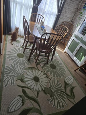 Bring a touch of nature to your floors with this green floral outdoor rug from the Aloha Collection. The oversized daisy pattern truly pops thanks to a subtly raised finish that adds a surprisingly soft texture to the flatwoven surface. This contemporary rug is stylish and functional, pulling double duty as a foundation for both your indoor and outdoor spaces. Hand washable outdoors: rinse with a hose and air dry.