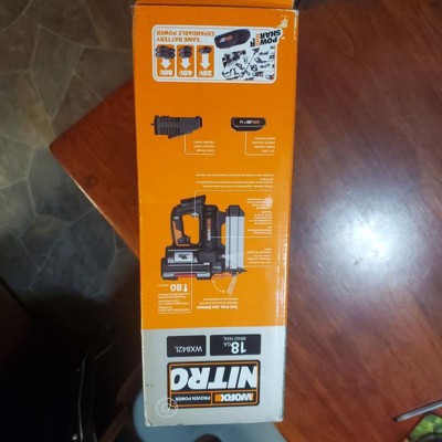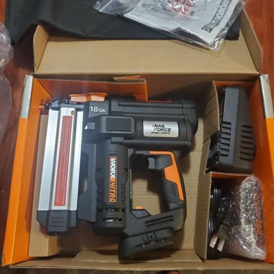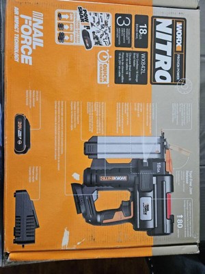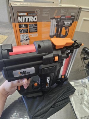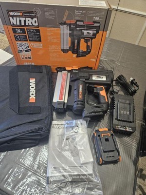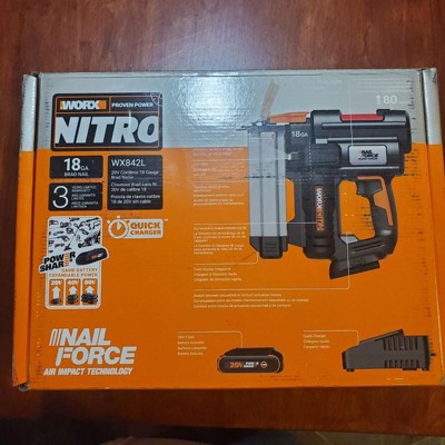 [This review was collected as part of a promotion.] Worx Nitro 20V 18ga Brad Nail Gun I am very impressed with the power and speed of this brad nailer. I have operated several air powered brad nailers in the past and this new Worx Nitro 20V 18ga brad nailer operates just as fast and with more power. I was able to use this to complete so many tasks that I neglected to do previously because of the hassle of getting the air line, air compressor, extension cord, and brad nailer. The worklight provided a proper amount of the light to ensure that the nails went in just the right place. The light will also blink to indicate certain things, like battery level and when it's out of nails. This brad nailer also has the option to operate in single or continuous mode. I am usually more interested in accuracy over speed so I tend to always use the single nail mode. I shot more than 100 1.5" nails into pine and the battery level barely moved. I will say that this battery powered air nailer is heavier than its air powered counterpart, however the convenience of this cordless brad nailer far outweighs the impact of the weight difference. I appreciate that this brad nailer uses standard 18ga brad nails. These nails are inexpensive enough to have every size on hand for whatever the next project is. This nailer came with a charger and a carrying bag. The charger is a real charger, not a small wall transformer with a thin wire. The battery charged quickly and operated as you would expect with indicator light providing feedback on things like charger status, and battery warnings. The carrying bag is plenty big enough for the nailer, battery and charger. There is even enough space to toss in safety gear, extra nails, and some hand tools. Overall this new 18ga brad nailer by Worx far exceeds my expectations. The unit is well built, powerful and fast. Well done Worx!
