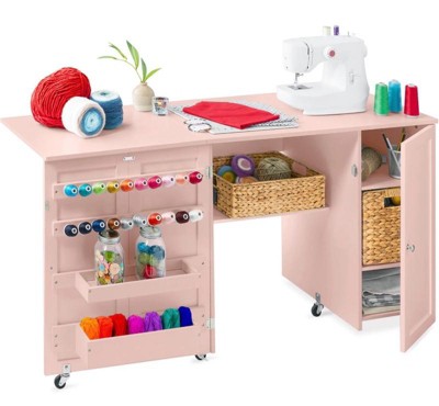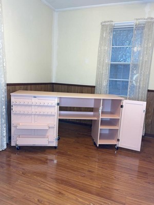 [This review was collected as part of a promotion.] I was gifted this product in exchange for my honest review. - this fold up, portable crafting table is everything ! It is really sturdy even when opened up. It has so much storage space with shelves and cubby baskets, and folds up easily to give you more floor space when not in use. It’s easy to move around since it’s on wheels and the wheels have locks so when you put it where you want it , it doesn’t wiggle around.