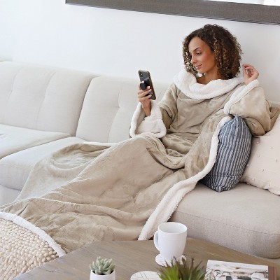 Oversized sleeves make sure you can move your arms and hands, but still be wrapped in warmth. The product does not slip & slide like a regular blanket.
