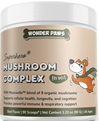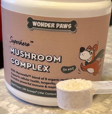 Wonder paws mushroom complex is a powder that promotes cellular health and longetivity. Supports respiratory and immune health for dogs. I have been using the powder twice a day by sprinkling it on my dogs food. Usually with a mix of dry dog food and some protein for healthy coats and full doggies. They are usually pretty happy with their food and have had no complaints or change in their bowel movements.