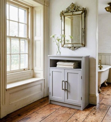[This review was collected as part of a promotion.] This bathroom cabinet is the perfect size for anywhere in the house, it looks very elegant and has great storage. Also, the grey color is very pretty and it was very easy to install.