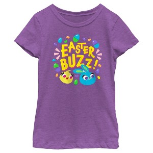 • Grab a basket and go on a hunt for this Easter girls' t-shirt! Featuring Ducky, Bunny, and the phrase: "Easter Buzz!" surrounded by festive eggs and jelly beans across the front.