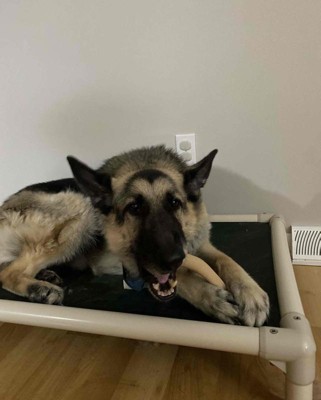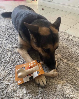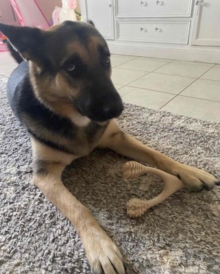I've been on the hunt for a new bone for my 2 year old GSD. As soon as I opened the package, my dog was excited and wagging her tail. She immediately started chewing on it and seems to really enjoy it. The material doesn't appear cheap or or crumble like other plastic-type bones. I love that there are different textures on it to aid in keeping her teeth clean as well! This will definitely keep my dog happy and busy for a long time! I received an incentive to write this review.