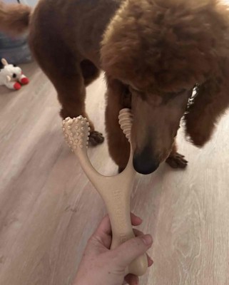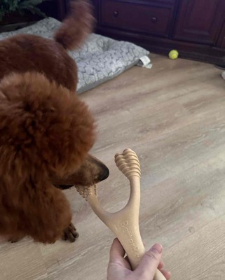 Our 55lb 1.5 year old Labradoodle LOVES this chew. This is a great chew to keep her busy and stimulated. The design of the chew being a wishbone is great because she can use her paws to hold down the 2 sides as she chews on the other. She is very proud of her chew and brings it everywhere with her, granted it’s been 2 days but it hasn’t left her side in the 2 days we’ve had it. This chew is very very hard so if you have a dog that picks up and drops things a lot on purpose that’s something to be mindful of. I received an incentive to write this review.