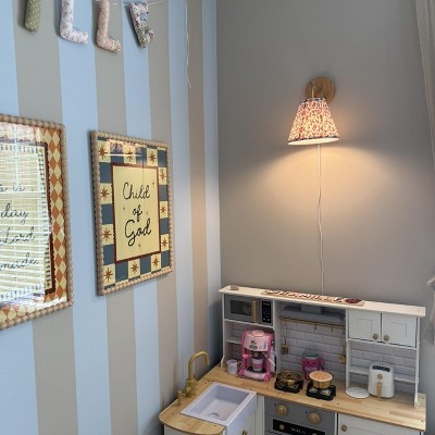 This wall sconce lamp is both functional and beautifully designed, adding a touch of charm to any space. The wooden base is high quality, sturdy, and easy to attach to the wall, making installation a breeze. The floral fabric lamp shade is absolutely stunning, featuring dark green leaves and two tones of vibrant pink flowers that bring a fresh and elegant look to the room. The fabric itself is thick and durable, ensuring it holds its shape over time. Since it's a plug in lamp, you’ll need a nearby wall outlet, but that also makes it convenient, no hardwiring required. Overall, this sconce blends beauty and practicality effortlessly, making it a stylish addition to any home.