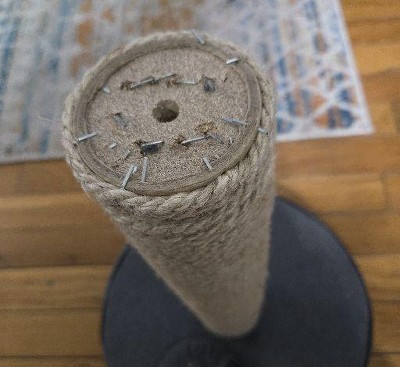 I had this less than a week and it fell apart. The top part with the tether popped off, leaving exposed staples. I couldn't securely re-attach it so I had to throw the whole thing out because I didn't want my cats to injure themselves on the staples.