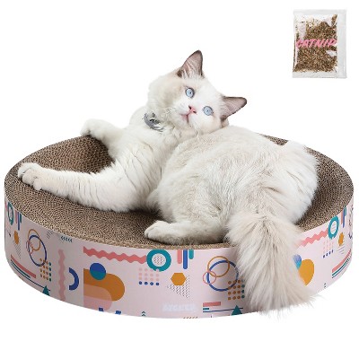 THE LICKER STORE Rini 23.75" Modern Cardboard Lounge Bed Cat Scratcher with Built-In Bell Toys and Catnip, White/Multi Set of 2