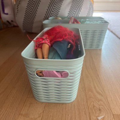 I absolutely love these little plastic storage bins. They are perfect for small items. I put my daughter‘s Barbie dolls in them and they fit perfectly. I love the mint green color of the storage bins. The weaving on the bins makes them look much more decorative. I love that you get a set of three of these bins for a very reasonable price. These looked great on my daughter’s shelves. I received an incentive to write this review.