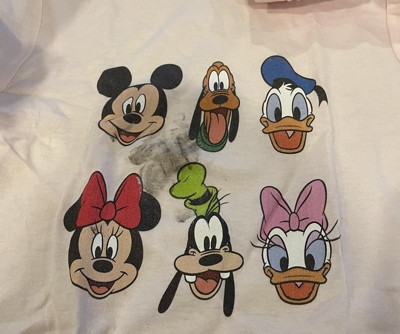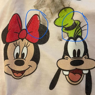 The print quality of this shirt was terrible. Some of the color on Minnie’s bow and Goofy’s hat were coming off as I took it out of the package. The shirt also came with a big dirt mark on the front.