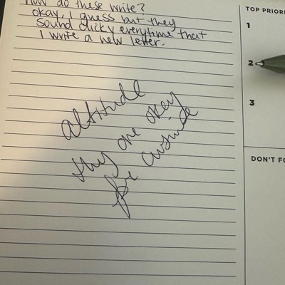 These pens are cute and have nice colors but they just feel cheap. The barrel is very plastic-y feeling. When I write it clicks after I remove the pressure from the tip on each letter.. kind of annoying actually. It writes better for cursive but who writes all in cursive. It’s nice that they are sustainable and recycled material but they just feel cheap like a doctors office pen.