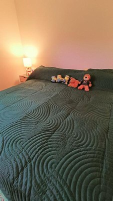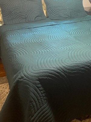 [This review was collected as part of a promotion.] The VCNY Sands Quilt Set comes in a poly bag. The 3-piece set includes a quilt and 2 standard size shams. The set I received is a size full/queen (90x90) with two 21x27 inch shams in dark green. The green color is very deep, almost bordering on being black. The design that is stitched in is a very neutral yet still fancy wave pattern. Both the quilt and the shams have the stitched pattern on them. The quilt is the perfect size for either a longer length full bed or a shorter length queen bed. I like the thickness of the quilt; it's perfect for spring or fall when the temperature is not too hot or too cold. I would recommend this quilt to family and friends.
