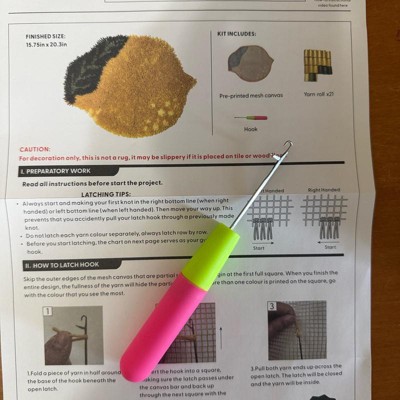 This is a very cute latch and hook craft that creates a lemon accent rug. All the materials are very organized. It comes with yarn, a pattern, directions, and a hook. The size of the rug was a little smaller than I thought it would be. I would say this is more suitable for older kids. Overall, a very cute craft set.