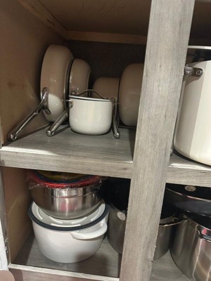 Purged my old mismatched pots and pans. Replaced with 30 pieces of caraway. Love the cleanup. Only draw back is the racking with the pans are too high for my slide out cabinet shelves.