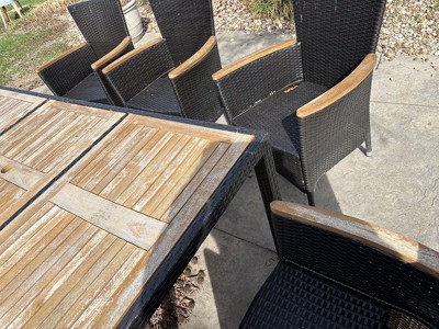 Durability Meets Design: This patio dining set features fade-resistant PE rattan, solid acacia wood, robust umbrella fabric and metal support, which ensure longevity, meaning more memorable outdoor moments year after year. These materials also bring sophisticated design.
