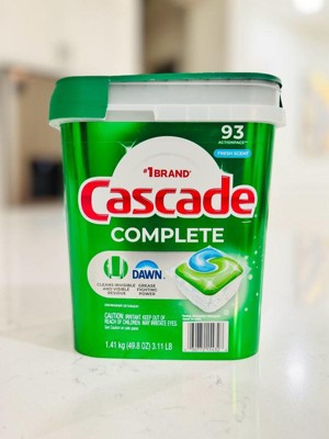 Very dissatisfied with Cascade Complete, 93 action packs. Does not remove spots or baked on foods even after I washed Pyrex dish! Silverware does not come out clean. My water temperature is perfect 120° or more. No more cascade for me.