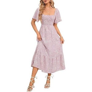 Features: The summer smocked midi dress with short flutter sleeve, square neck, stretchy smocked design, elastic high waist, beautiful boho floral print, a flowy swing-tiered bottom, inner lining about knee length, pleated ruffle hem. The shape is so flattering and we owe it to the full elastic bodice and flowy bottom, fit the body perfectly. Sexy square neck dress which you can also wear as an off-shoulder dress. Take it on vacation or run on the beach in summer! Also can be a maternity dress.