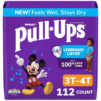 Make potty training a routine with Pull-Ups Night-Time Training Pants for Boys! Pull-Ups Night-Time Potty Training Pants absorb up to 25% more than diapers* and are up to 100% leak-free with extra absorbency compared to our other Pull-Ups products. Not only that, but these potty training underwear deliver up to 12 hours of overnight protection where boys need it most. Refastenable, easy-open sides allow you to keep clothing on your toddler for quick changes, even in the middle of the night. Each Pull-Ups training pant is made with soft and breathable materials, so your Big Kid can stay comfortable as they sleep. They also feature stretchy sides and an underwear-like fit so you can train consistently from day to night. Our nighttime potty training pants feature Disney designs of Mickey Mouse, with graphics that fade when wet to help your child learn and celebrate dry nights. No matter where your child is in his potty training journey, the Pull-Ups brand can help. Visit the Pull-Ups website for expert articles, tips and potty training resources. We've helped train 60 million Big Kids and counting! Pull-Ups Night-Time Boys' Training Pants are available in sizes 2T-3T (16-34 lbs) and 3T-4T (32-40 lbs). (*vs. size 3-5 Huggies Little Movers diapers)