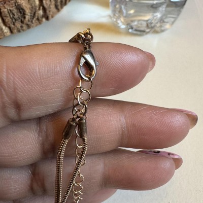 The necklace is really cute. It’s sort of a rose gold look. It’s the perfect length with a decent clamp. I get compliments on it, but throughout the day, it twist like crazy. I’m constantly unraveling it. Additionally, the clamp has tarnished. It only cost $15, so take that for what it’s worth. I’ll still continue to wear it, however, if you’re looking for top notch jewelry, I’d recommend something of higher quality that is stainless steel based.