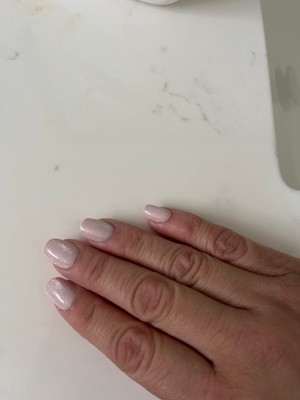 my favorite set! soft pink with sparkle, so pretty. soft and sweet. squoval shape is my favorite and this length is perfection. (my other favorite set le pearle) glue is best i found.