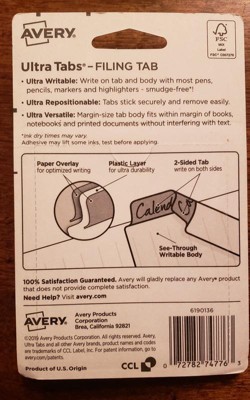 [This review was collected as part of a promotion.] I got the Avery ultra tabs about 3 weeks ago and have used them ever since. The repositionable tabs are fantastic and makes filing and organizing a breeze Being able to write on both sides with pen or pencil is a great feature too..great product