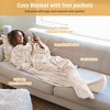 SIZE: 75" x 53”, one size fits most adults for snuggling up to. Feet pocket Length: 20", Feet pocket circumference: 16" Machine washable