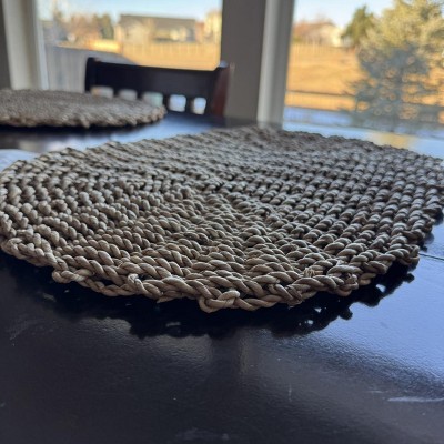 I know this is a charger but I got it to use for my hot baking pans, food and pots. It’s 19” by 13”, the perfect size for larger baking pans. It keeps the hot pans from scorching my counter. It’s woven, made with 100% lambapakany (what ever that is). It seems well made and good quality. I like the color and look of it.