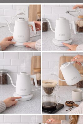 [This review was collected as part of a promotion.] I really love this electric kettle. The gooseneck spout makes pouring so easy, especially for my coffee and tea. The ivory color looks super clean and minimalist on my counter. It heats up fast and keeps the water warm, which is really convenient.