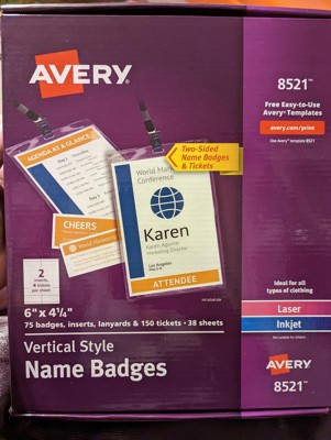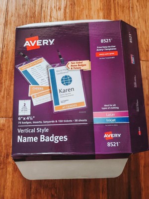 [This review was collected as part of a promotion.] Avery® Vertical Name Badges & Tickets, Durable Plastic Holders, Lanyards, 6" x 4-1/4", 75 Badges (8521) are perfect when trying to make an impression. My employees have no complaints when wearing there badges. Easy to change and design using free designs and templates at avery.com/templates. Currently customized with Christmas designs.