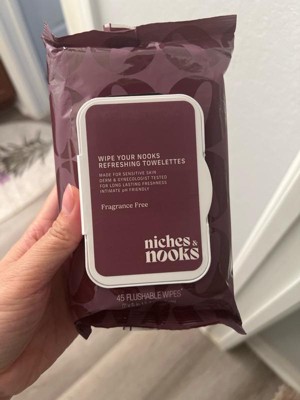 [This review was collected as part of a promotion.] The Niches and Nooks towelettes were just ok. They felt no different than using other similar flushable wipes. The only plus is that these would come in handy for camping trips or when a shower is not immediately possible. There was no scent and the packaging is simple. I’m unsure if I would purchase these again.