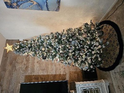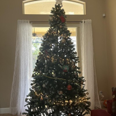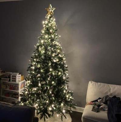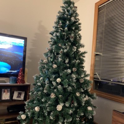 I really Love this Tree! It is even more Beautiful in person. I got the 7.5 foot Tree on sale for $89.99 on Target.com. It said it would take about 10 days to get here and got here in 2! As long as you take the time to fluff out the branches, read the instructions on how to arrange each branch, it will come out gorgeous, without any gaps. It took about an hour with 2 people. Each branch has frosted tips and a pinecone on the ends. The pinecones are nicely secured by a wire and most need to be adjusted or flipped over. The Tree looks Beautiful even without lights or ornaments. The only Drawbacks (which I'm totally fine with) are: - The branches are best with very light ornaments. Heavier ornaments are a little hard to hang on. - It was really hard to put the star on top, it kept falling, the branches aren't sturdy enough. I was able to put a chopstick inside the star holder and then arrange the branches behind it and it's staying up now. However, if you move or shake the tree, the star falls. Maybe my star is too heavy. - The last thing is my ornaments kind of blend in with the tree, but that's not an issue with the tree. I have bronze, gold, silver, and white ornaments. I'm going to buy some turquoise colored ornaments to add some pops of color. This is my first fake tree and I am beyond happy with it! It is Gorgeous! Also, for reference, we have 9 ft. Ceilings.