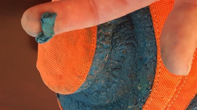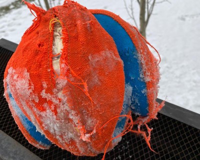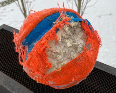 Sophie loves all of her Chuckit toys (esp the Flying Squirrel), but I had to take her Kick Fetch away when the blue part began breaking down. It's hard to describe precisely, but it seems to have gotten soft and gooey, almost like semi-cured gum under a bench. No idea what the blue stuff is made of, but I can tell you it is sticky and won't wash off your fingers with just soap. Thank goodness her only interest is in fetching - if she was a chewer she'd have a digestive tract full of that stuff. Teeth punctures in canvas are excusable. This is simply unacceptable for a product designed and intended for mouths. BTW, this ball has been well-maintained - I always hose if off after play and store it a watertight deck box. It has never been left out in the weather or exposed to any chemicals or cleaners.