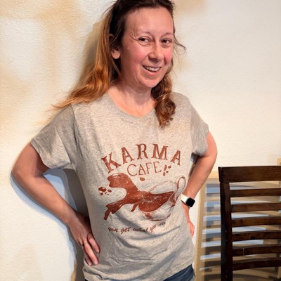 I love this Tshirt. Karma Cafe - You Get What You Deserve. The graphics are super funny. This shirt really hits home. Anyone that believes in karma needs this shirt! I bought a woman’s size large. It has a slight stretch to it and it is very soft. It is super comfortable and I will be wearing this anytime that I know I will be seeing someone who needs a little karma reminder.