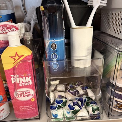 It’s perfect for holding large amounts of dishwasher pods and it fits the scrub mommy on the top. It’s bigger than i expected, it could hold multiple sponges. I love that it’s clear, it’s really nice for organizing, but it’s also aesthetically pleasing! The sponge holder part comes out, so you can easily refill the pods.