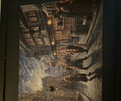 One the puzzle is larger than you think. The picture on the front is misleading. As well as the color of the pieces being so dark and alike. It took me 6 hours before I said I give up. I was driving myself crazy and that’s not what a puzzle is supposed to do