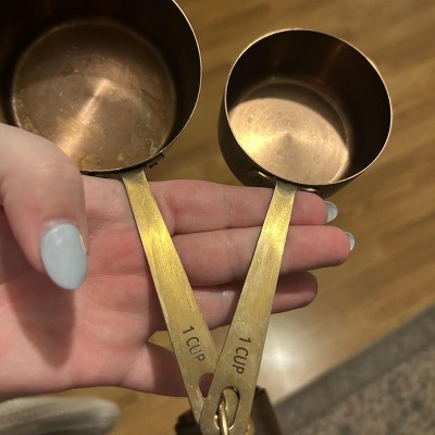 These are so cheaply made. The “brass” started to fade after one use and wash & any liquid you put in the measuring cup leaks through the holes where the handle is attached to the cup. Don't waste your money. They look nothing like the photo either. They handle is a different shade from the cup for some reason.