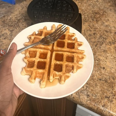 Perfect size and easy to use. Waffle was light and fluffy and did not stick at all. Very pleased with this appliance .