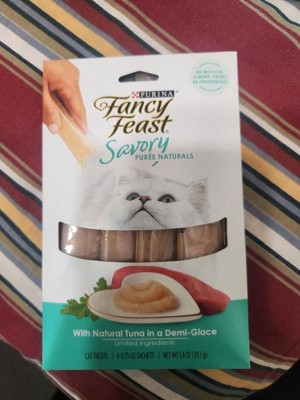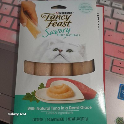 [This review was collected as part of a promotion.] I offered one of these Purina Fancy Feast Savory Purees With Tuna Lickable Cat Treats to each of my three cats, and only one would eat it. Apparently my other two cats are picky! I like that the tuna is hand selected and that there are no artificial flavors, colors, or preservatives. It's a treat I feel good about giving my cat! #sponsored