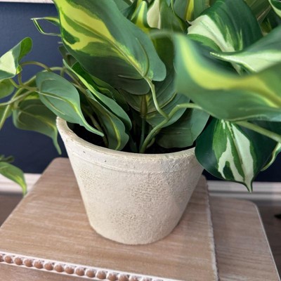This is a bright green faux variegated leafy plant with large leaves. The plant pot is solid and stable and in a neutral cream color. It looks great on a shelf or in a window or on a table as a centerpiece. It would go with most interiors and easily fit into most houses or businesses decorating styles and interiors.