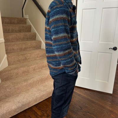 My husband is pictured here wearing a size large, which is his true to size fit and overall this fit him perfectly and is so warm and cozy the perfect item to wear while lounging around the house or running a few errands around town. The soft material will wash well and this vintage style is definitely on trend for this season.