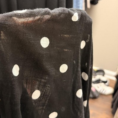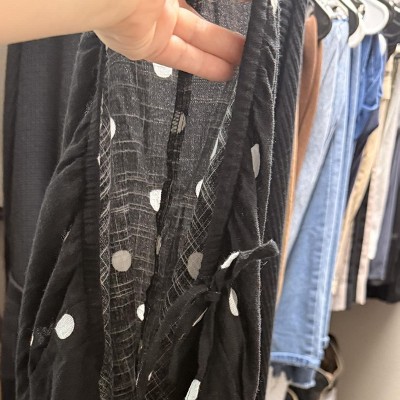 Very cute in the on trend polkadot pattern. The fabric is really soft and drapy, almost a libit like a gauze material. I actually am going to hem them so they’re a little bit cropped because I like that shape better for a wider leg, but that’s just a personal preference. They stretch out quite a bit when you wear them so definitely don’t size up. I think they are true to size but they get a tiny bit baggy which again I actually like in this style.