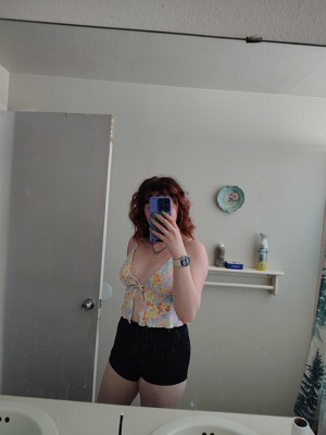 Fly away tankini top from Wild Fable™ adorned with a seamless floral print and lettuce-trim hem. Features a sweetheart neckline with tie-front detailing and smocking on the cups.