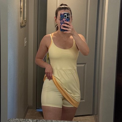 • Must-have features: built-in shorts with side stash pocket, built-in shelf bra, scoop neckline, crisscross strappy back, mini length, regular fit