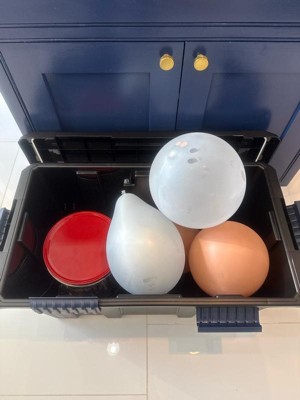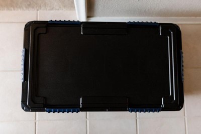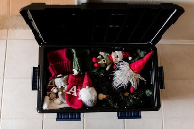 [This review was collected as part of a promotion.] This is an awesome storage bin! Somehow both lightweight and really solid in feel, for sturdiness that isn't bulky! Compact and just the right size for my needs. I loved it for organizing special small things from Christmas that I needed in weather-safe, airtight storage. Makes me not afraid to put handmade things away in the garage! Love the dark blue details to give it some style that blended well with our home aesthetic.