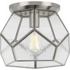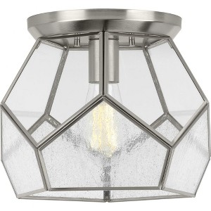 Introducing the Cinq Collection from Progress Lighting, featuring a stunning flush mount light crafted from durable steel with a sleek brushed nickel finish. With a width of 12", height of 9.25", and length of 12", this modern geometric design is a true attention-grabber. The bohemian-style flush mount features glass panels creating a shade that holds an industrial light base inside. This damp-rated fixture is perfect for adding a touch of modern elegance to any space. With a single incandescent bulb and a wattage of 100 watts, this fixture provides ample illumination. Assembly is required, and the canopy with a diameter of 7.88" is included. Elevate your space with the Cinq Collection from Progress Lighting.