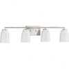 The Spenser vanity light has a streamlined design finished in subtle Brushed Nickel contrasted by machined industrial-styled knurling. Rounded opal glass shades soften the fixture�s industrial look.�The versatile fixture can be mounted with the shades facing up or down to suit your preference. The vanity light is perfect for bathrooms / The light's mechanical styling is ideal for Industrial and Soft Modern settings / A Brushed Nickel finish emphasizes the fixture's knurled design / Opal glass shades soften the industrial style of the light and provides subtle illumination / Mount the light fixture with the glass facing up or down for more design flexibility / Uses (4) 100-watt max medium base bulbs or LED equivalent, that is sold separately, and dimmable when used in conjunction with a dimmable bulb / Measures 32.87-in. width by 7.62-height, extends from wall 5.5-in. / Certifications: Damp location listed, fixture can be used in rooms where moisture may be present / Our 1-Year Limited