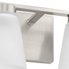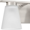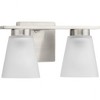 Fill your house with the lively Tanner family of fixtures. Strong lines accent the Brushed Nickel frame in a simple balance of form and function, while soft etched glass shades complement the design.�The versatile fixture can be mounted with the shades facing up or down to suit your preference. The vanity light is perfect for powder rooms and bathrooms / The light's simple lines are ideal for Transitional settings / A Brushed Nickel finish emphasizes the fixture's lively design / An etched glass shade provides subtle illumination / Mount the light fixture with the glass facing up or down for more design flexibility / Uses (2) 60-watt max medium base bulbs or LED equivalent, that is sold separately, and dimmable when used in conjunction with a dimmable bulb / Measures 13-in. width by 7.12-height, extends from wall 6.5-in. / Certifications: Damp location listed, fixture can be used in rooms where moisture may be present / Our 1-Year Limited Warranty guarantees your complete satisfaction