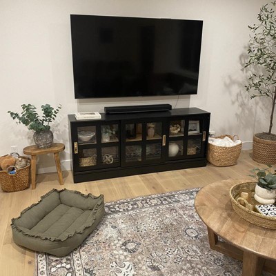 A: The TV stand features sliding doors with clear glass panes and a gold-tone pull.