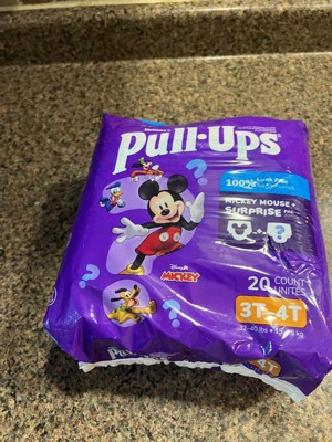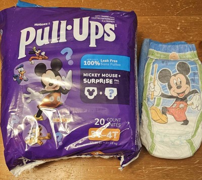 Build Big Kid confidence while potty-training with Pull-Ups Training Pants for Boys! Up to 100% leak free where boys need it most, Pull-Ups training pants back them up so misses don’t become messes! Designed with soft and breathable materials and a wide, stretchy waistband, Pull-Ups potty training underwear help your child be comfortable. To help foster Big Kid independence, these potty training underwear go up and down fast like undies, building Big Kid confidence as you potty train. Easy open, refastenable sides help to make changing the pull up quick and easy, even when you are on-the-go. These training pants also feature toddler loved designs from Disney’s Mickey Mouse. Only Pull-Ups has Disney designs to get your Big Kid pumped for potty training. Fading graphics help teach your Big Kid to stay dry. To help them stay motivated, tell your Big Kid a story that Mickey loves making music and you can help keep the music going by staying dry! When your child is ready to begin his potty training journey, the Pull-Ups brand can help. Visit the Pull-Ups website for expert potty training tips and resources. We’ve helped train 60 million Big Kids and counting!* Pull-Ups Boys Training Underwear are available in sizes 2T-3T (16-34 lbs), 3T-4T (32-40 lbs), 4T-5T (38-50 lbs) and 5T-6T (50+ lbs). (*US and CA)