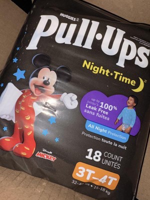 Make potty training a routine with Pull-Ups Night-Time Training Pants for Boys! Pull-Ups Night-Time Potty Training Pants absorb up to 25% more than diapers* and are up to 100% leak-free with extra absorbency compared to our other Pull-Ups products. Not only that, but these potty training underwear deliver up to 12 hours of overnight protection where boys need it most. Refastenable, easy-open sides allow you to keep clothing on your toddler for quick changes, even in the middle of the night. Each Pull-Ups training pant is made with soft and breathable materials, so your Big Kid can stay comfortable as they sleep. They also feature stretchy sides and an underwear-like fit so you can train consistently from day to night. Our nighttime potty training pants feature Disney designs of Mickey Mouse, with graphics that fade when wet to help your child learn and celebrate dry nights. No matter where your child is in his potty training journey, the Pull-Ups brand can help. Visit the Pull-Ups website for expert articles, tips and potty training resources. We've helped train 60 million Big Kids and counting! Pull-Ups Night-Time Boys' Training Pants are available in sizes 2T-3T, (16-34 lbs) 3T-4T, (32-40 lbs) 4T-5T (38-50 lbs) and 5T-6T (46-60 lbs). (*vs. size 3-5 Huggies Little Movers diapers)